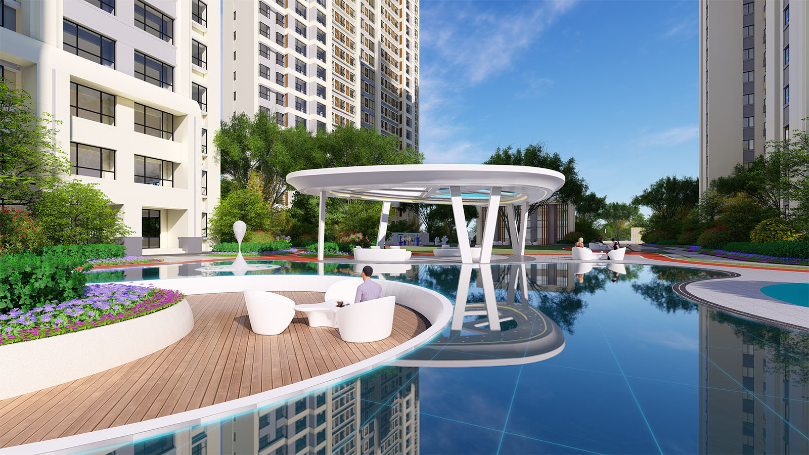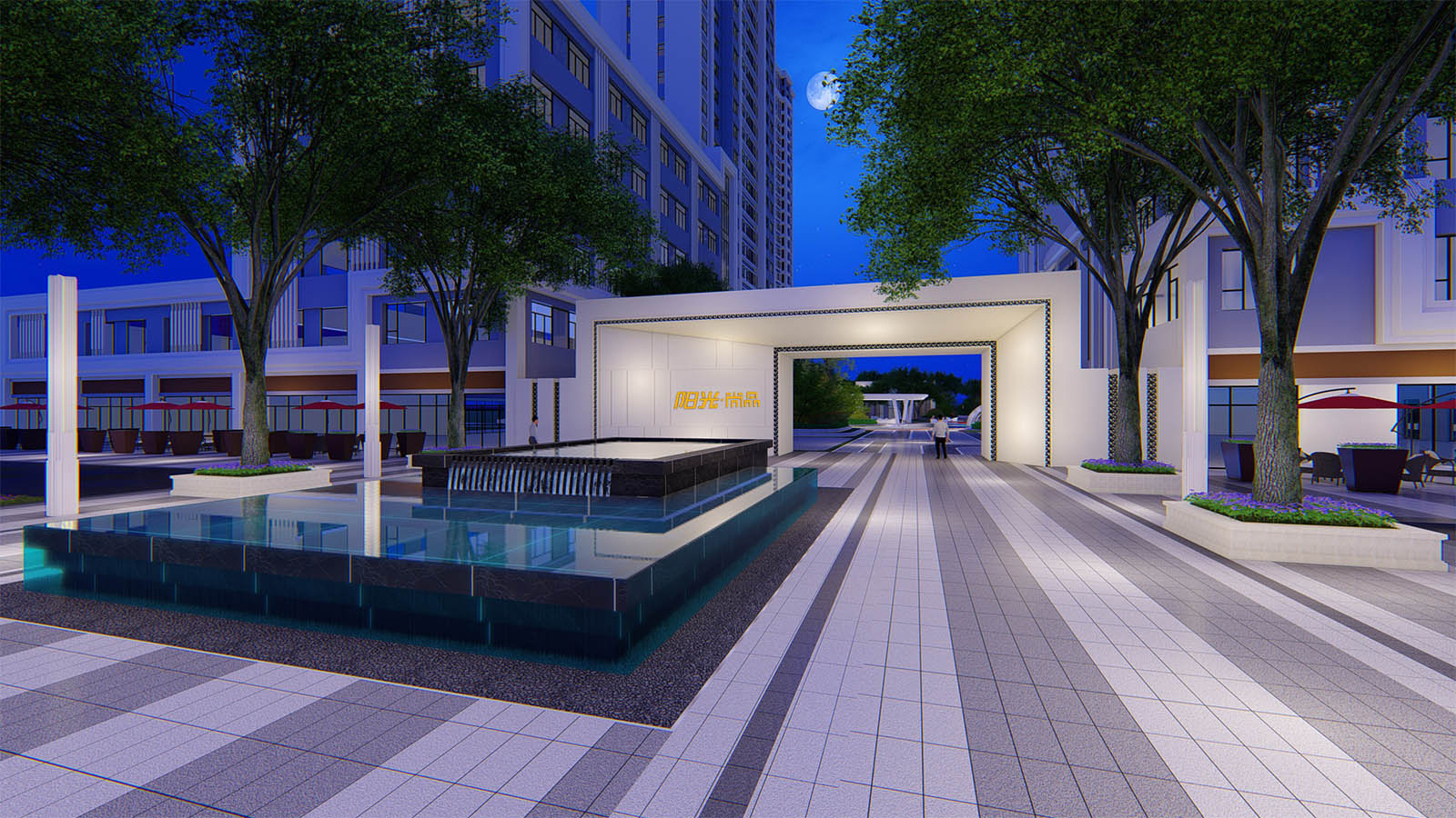 主入口重新梳理原有的商業(yè)車行交通動(dòng)線,通過林蔭樹陣及景觀燈柱的布置,隔離車行動(dòng)線,并引導(dǎo)車流由南北兩處車行入口進(jìn)入,入口廣場采用簡雅的設(shè)計(jì)手法,保證人行動(dòng)線安全、流暢,布置鏡面疊水水景,結(jié)合景觀樹陣與燈柱營造禮儀迎賓氛圍,引導(dǎo)業(yè)主悠然歸家。