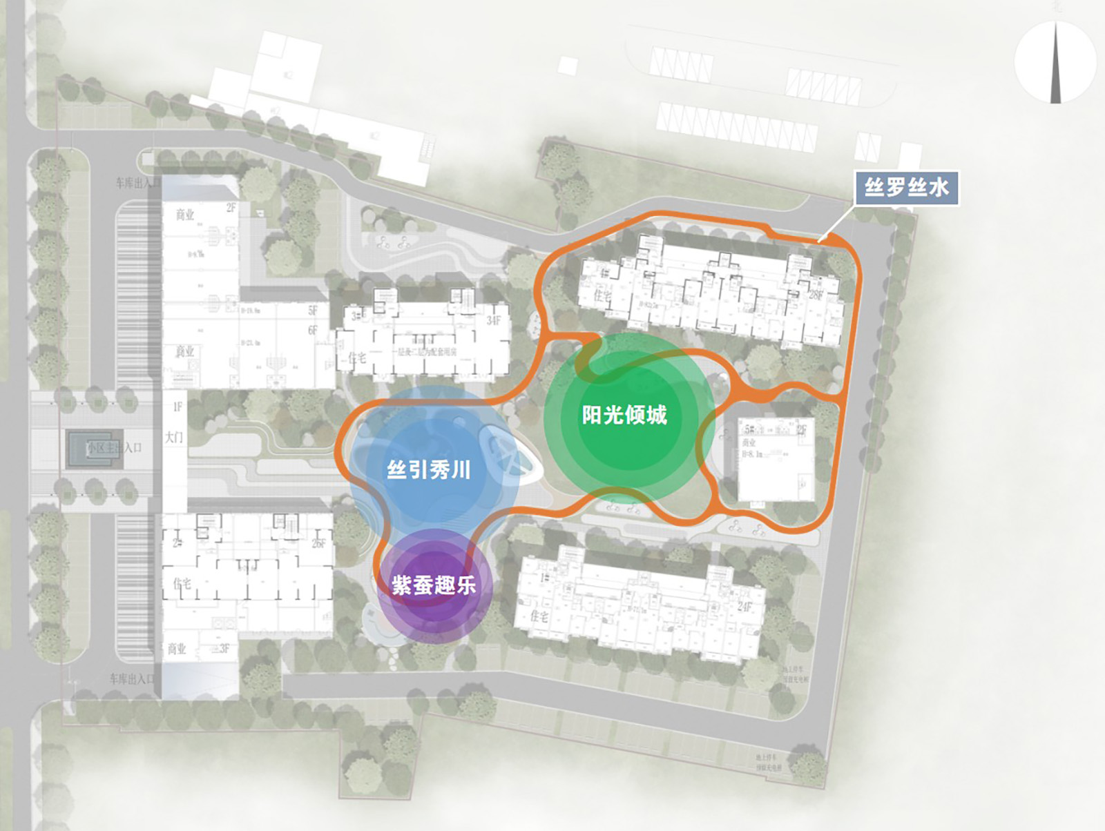 以環(huán)繞式的設(shè)計(jì)手法,梳理鏡面水系脈絡(luò),多層絲纏繞、絞合、牽連,往復(fù)不斷,讓觀者在社區(qū)中感受心靈的溫養(yǎng),