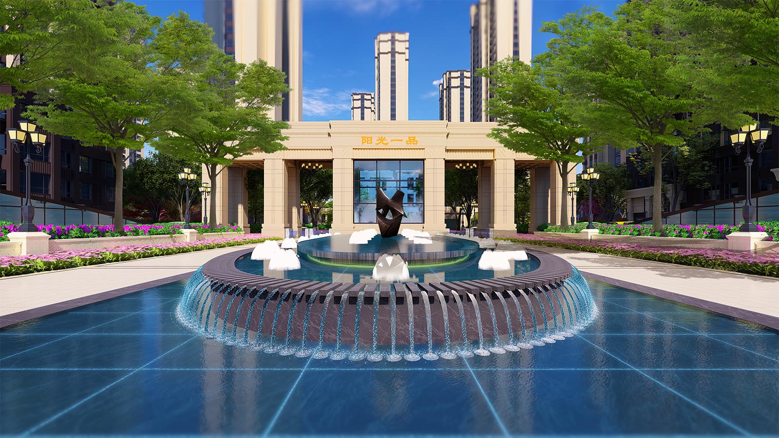 “迎光”主題雕塑概念源于“陽(yáng)光一品”案名,通過具有張力的具有射線感的紫銅質(zhì)感的雕塑形態(tài),將迎接業(yè)主歸家進(jìn)入陽(yáng)光一品的主題借此闡述。