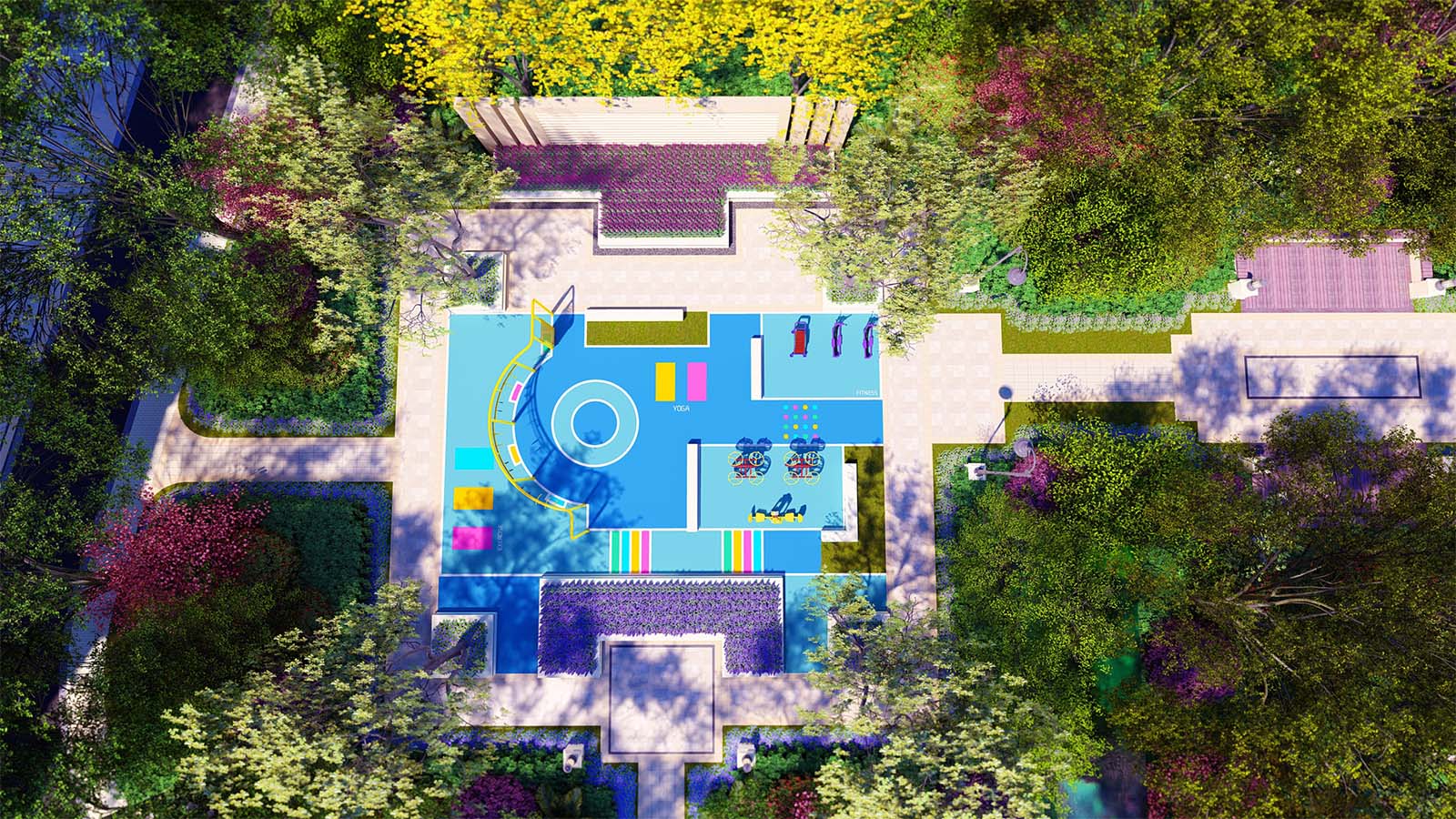 景觀上將其設(shè)置在地塊西北隅,降低運(yùn)動(dòng)對(duì)居民的影響,規(guī)劃設(shè)計(jì)綜合性的多功能成人健身場(chǎng)地,