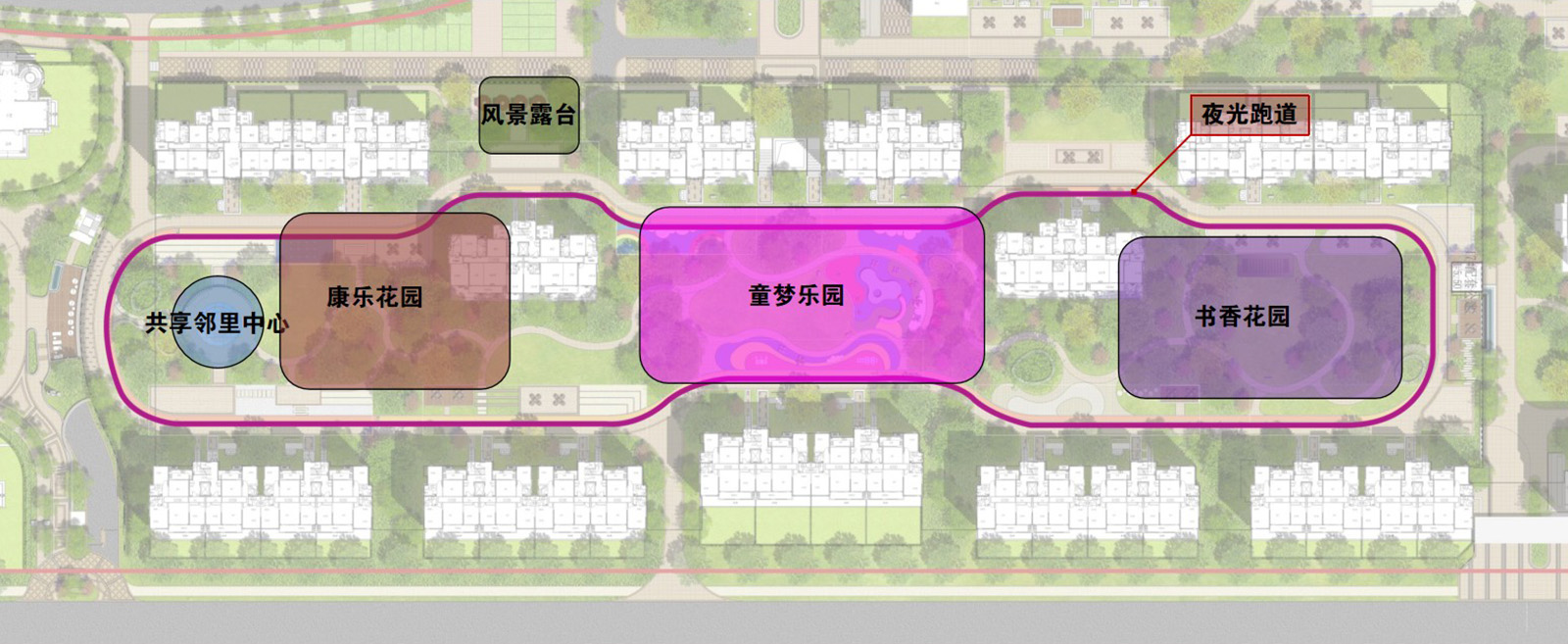 高層區(qū)以高端人才為目標(biāo)群體,宅間組團(tuán)設(shè)置以萌寵樂園、健身花園為主空間,配套設(shè)計(jì)多個宅前休閑空間的景觀功能區(qū),契合業(yè)主群體生活起居習(xí)性。