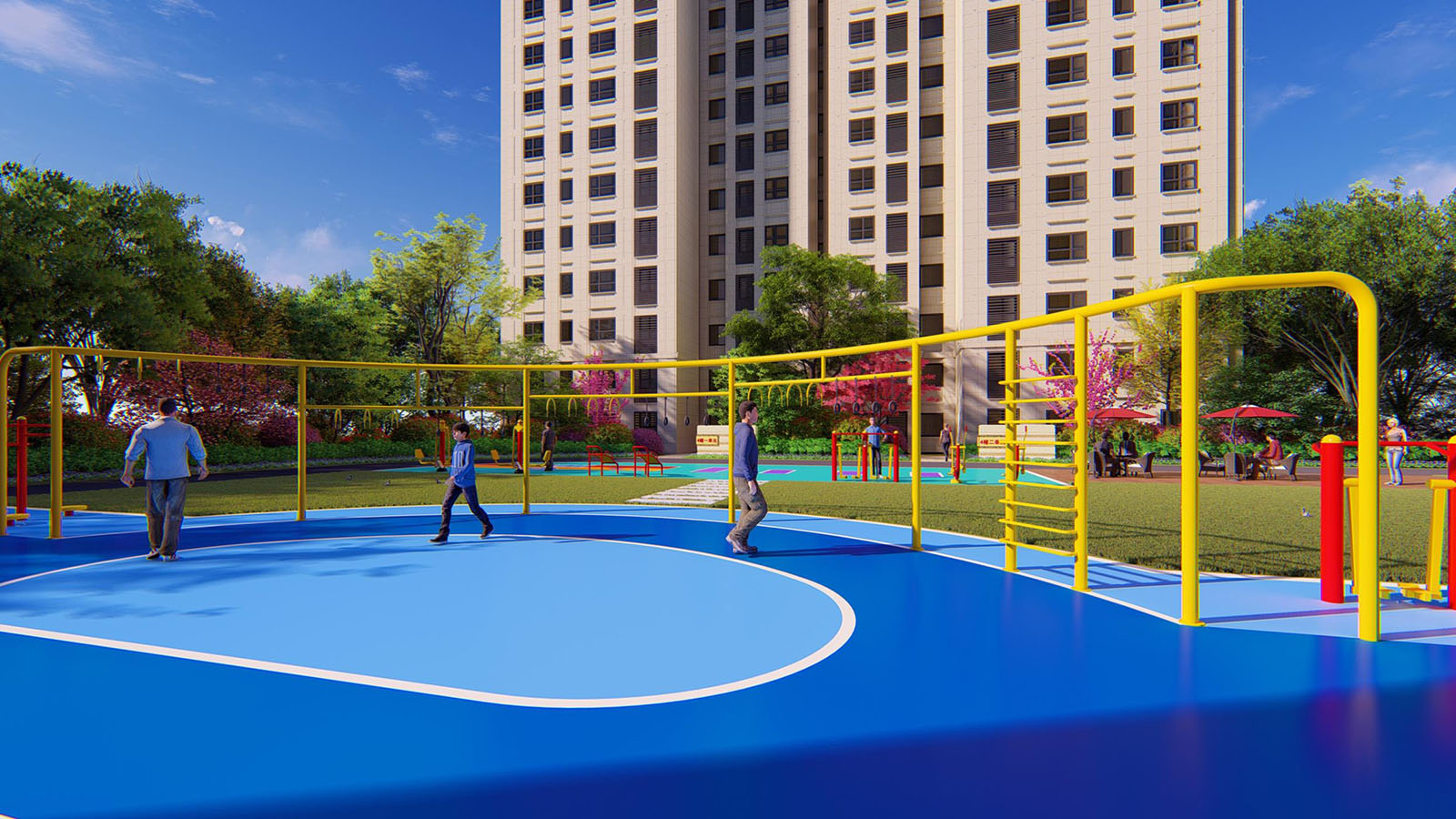 健身花園景觀上將其設(shè)置在地塊東北角隅,降低運(yùn)動對居民的影響,設(shè)計(jì)綜合性的多功能成人健身場地,其核心目的就是讓這個空間、消防登高面可以更高效的利用,讓成人開展多種健身活動,為居民的健康提供堅(jiān)實(shí)的設(shè)施基礎(chǔ)。