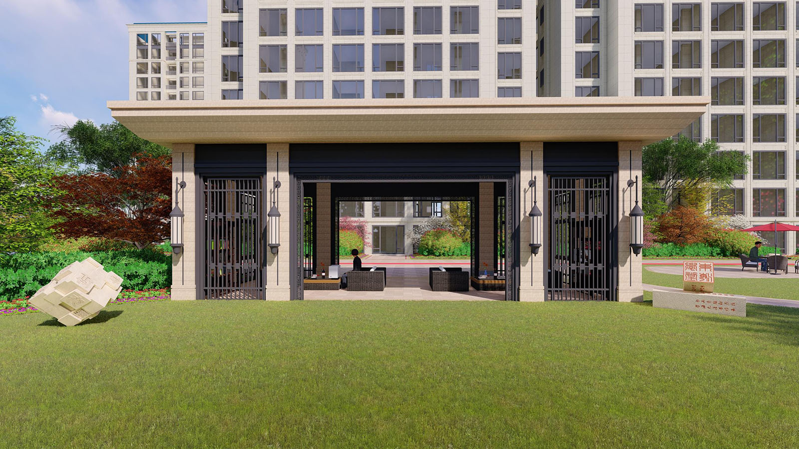 入口廣場的鋪裝線條、立面形象等風(fēng)格延續(xù)建筑與景觀新古典的時尚與韻味,尊貴與雅致,石庫門與景墻結(jié)合設(shè)計(jì),形成統(tǒng)一整體、雍容大氣的禮儀迎賓效果。